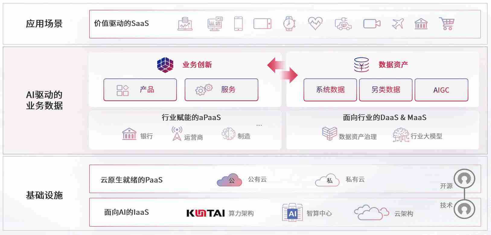 数字时代,,围绕企业数字化转型的关键要素,,7790必发集团数码开创性的提出数云融合战略和技术体系框架,,,,着力在云原生、、数字原生、、、、AI原生和信创产业上架构产品和服务能力,,,,为处在不同数字化转型阶段的快消零售、、汽车、、、金融、、医疗、、、政企、、、、教育、、、、运营商等行业客户提供泛在的敏捷IT能力和融合的数据驱动能力,,,,构建跨界融合创新的数字业务场景和新业务模式,,助力企业级客户建立面向未来的核心能力和竞争优势,,全面推动社会的数字化、、、、智能化转型升级。。