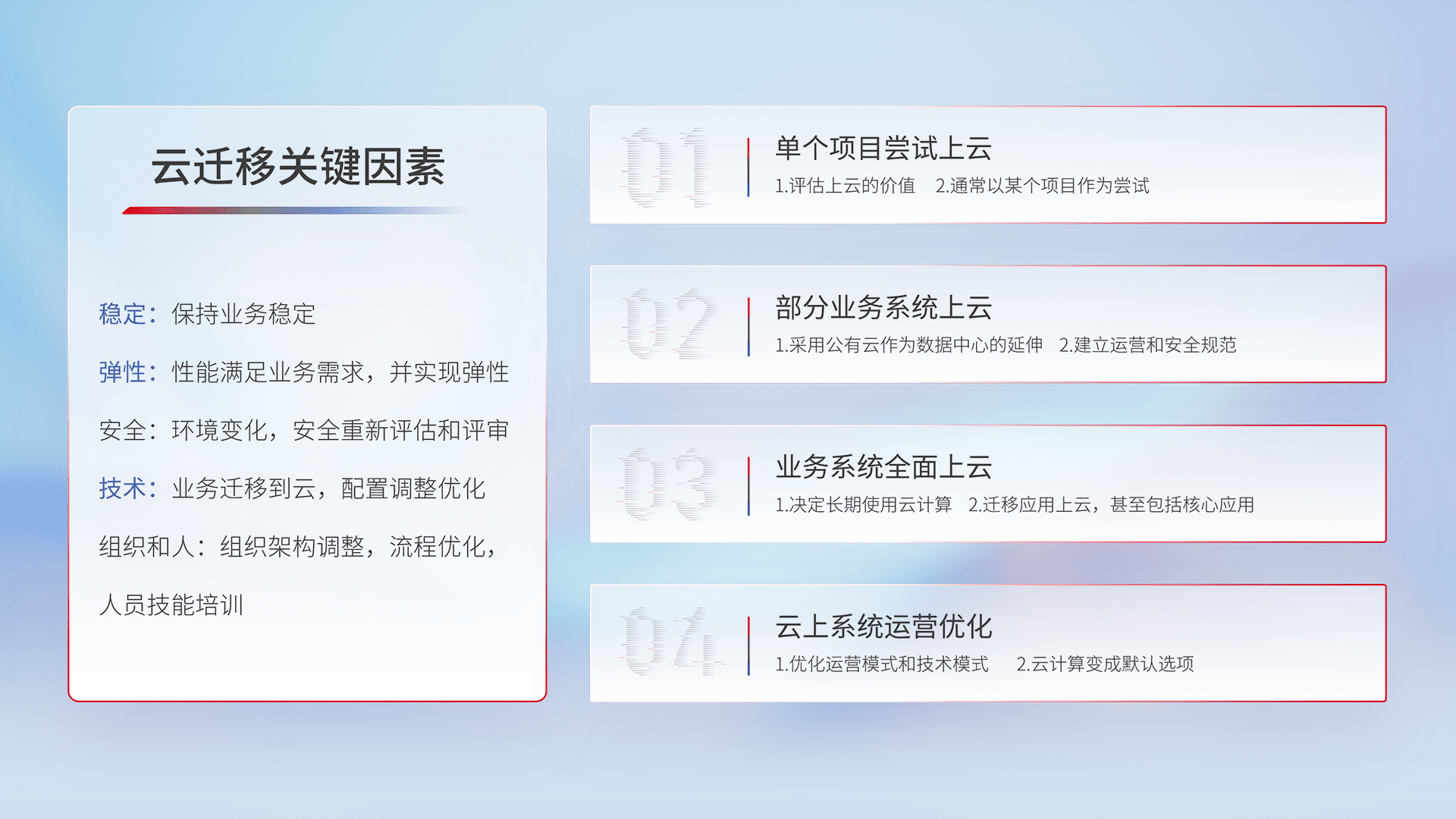 结合实际业务,,,,从规划设计、、、、云平台选型、、、云原生改造、、、数据迁移、、、集成交付,,,迁移全过程为客户识别最佳上云路径,,,做好风险识别管理,,,设计网络架构、、身份权限、、安全审计合规、、、操作审计、、日志审计、、、、监控告警策略、、多站点容灾设计等,,对云上基础设施进行整体规划,,提升IT治理水平,,,以满足弹性、、高可用、、、、高性能的需求。。