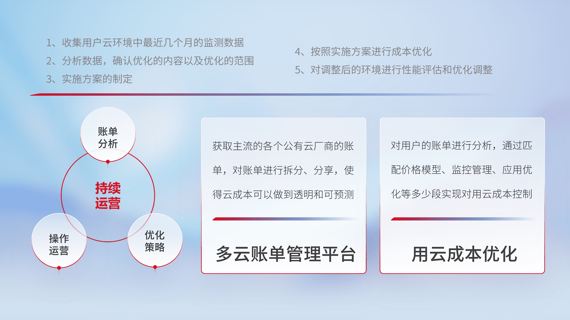 通过多云纳管,,,以统一的资源数据模型把客户的云资源进行抽象和封装,,,,进而实现对多云资源的统一操作,,,,保障云资源管理的可靠性、、稳定性与可用性。。。。量身定制化运维内容,,,配置、、开发运维、、、、补丁管理、、备份、、、监控、、、认证和访问管理、、审计和日常巡检等,,,保障在用云过程中的可靠度,,稳定度以及高可用率。。。。